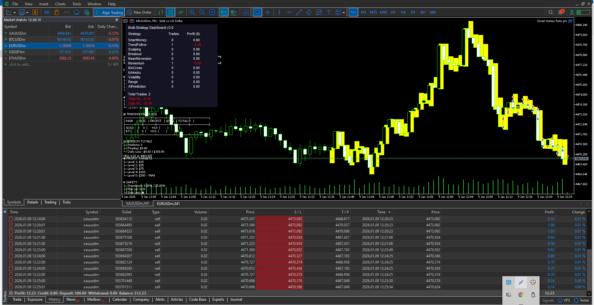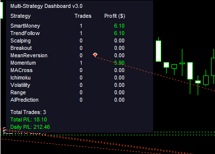 Smart Money Multi-Strategy Pro EA v3.0 is a professional Forex trading robot for MT5 & Mt4 designed using Smart Money Concepts, AI price prediction, and multi-strategy institutional logic.